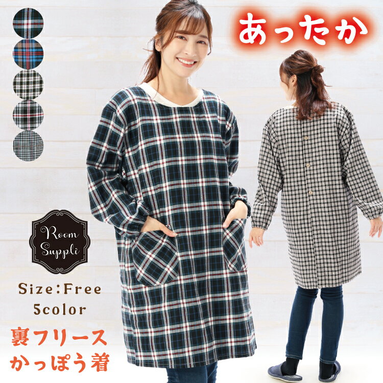 \10%off対象商品/割烹着 かわいい 保育士 かっぽう着 おしゃれ 冬 裏フリース付 スモック あったかチェック柄 かっぽうぎ エプロン 袖付き 袖口ゴム ポケット付き チュニック ギフト プレゼント 72351